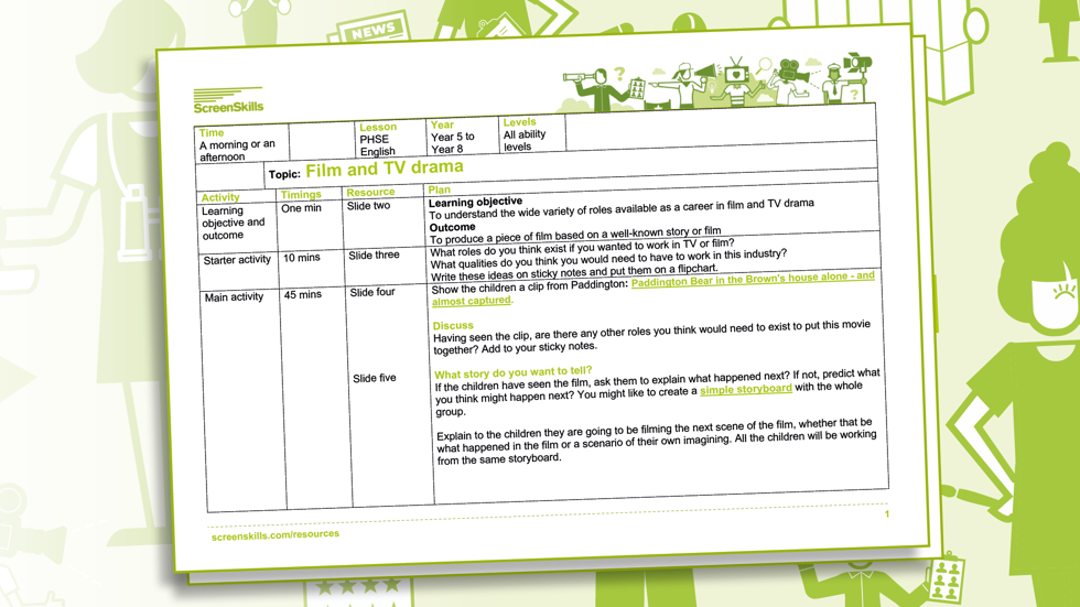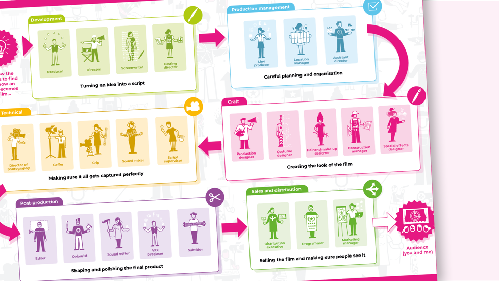 You might want to use our career map when explaining different roles. Download this map and print it on A3 paper or scroll through the different roles on our website: film and TV drama.